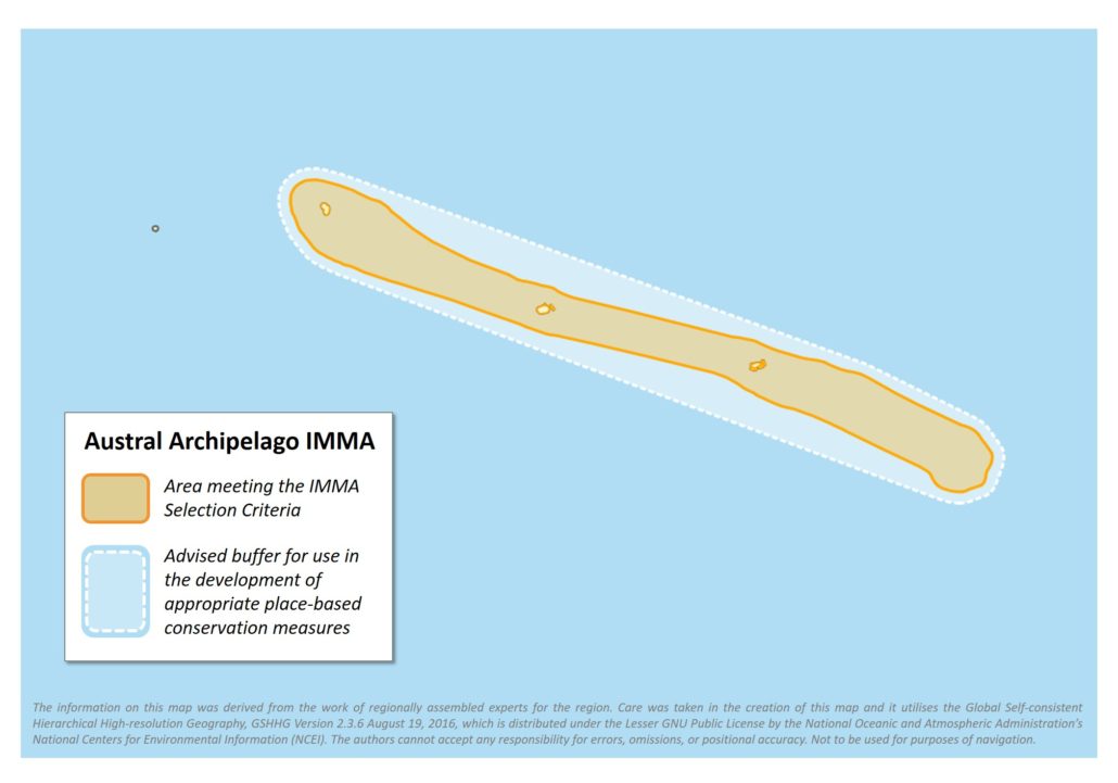 The Austral Islands are the southern-most archipelago in French Polynesia. Humpback whales (Megaptera novaeangliae) from the Oceania subpopulation classified by IUCN as Endangered, regularly aggregate around at least four of the archipelago islands (Rimatara, Rurutu, Tubuai and Raivavae) during the austral winter. Humpback whale group encounter rates are higher around these islands than in any other part of French Polynesia (with the exception of the Windward Islands) and the area has all the characteristics of being an important humpback whale reproductive area. Genetics and photo-ID studies suggest that humpback whales that frequent the Austral Islands are largely separate from those that occur elsewhere in the region. The whales are primarily found close to the shore or to the fringing barrier reef, but, as whales move between and among islands (each separated by approximately 200km), the IMMA includes both the coastal waters of each island, as well as the stretches of water connecting them.