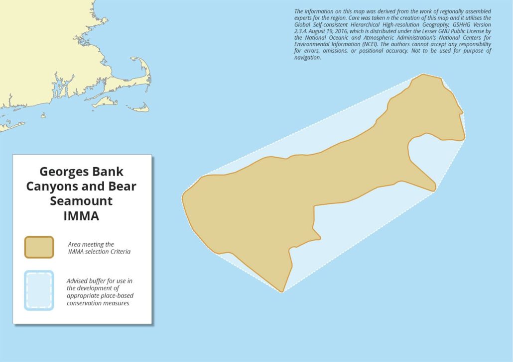 The Georges Bank Canyons and Bear Seamount IMMA is located along the slope and offshore waters of Georges Bank. It extends from Hydrographer Canyon in the west to Corsair Canyon at the northeastern tip of Georges Bank. The area is bounded at the shallow extent by the 100m contour and extends offshore to the deepwater extent of the canyons. This area comprises the only known aggregation region for True’s beaked whales (Mesoplodon mirus). Within this area, there are also Vulnerable sperm whales (Physeter macrocephalus) and foraging areas for a deep-diving cetaceans, such as Sowerby’s beaked whales (Mesoplodon bidens), Cuvier’s beaked whales (Ziphius cavirostris), and pygmy/dwarf sperm whales (Kogia spp). Finally, the area sustains a high diversity of 20 marine mammal species of which 19 are regularly present. The area includes part of the US Northeast Canyons and Seamounts Marine National Monument.