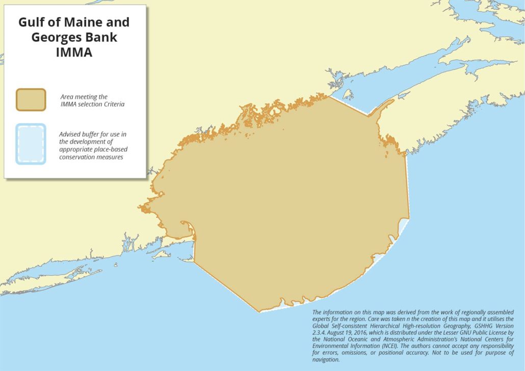 The Gulf of Maine is a continental shelf sea off New England and southwestern Nova Scotia. It is isolated from the Mid-Atlantic Bight to the south by the Nantucket Shoals, from the Scotian Shelf to the north by Browns Bank, and from the wider Atlantic Ocean to the east by Georges Bank. Strong circulation over complex bathymetry aggregates fat-rich zooplankton, the preferred prey of North Atlantic right whales, and many forage fish preyed upon by other marine mammals in many areas in this IMMA. It encompasses some of the most important foraging habitats for marine mammals along the U.S. East Coast. Within this area there are four threatened species: North Atlantic right whales (Eubalaena glacialis), sei whales (Balaenoptera borealis) fin whales (Balaenoptera physalus) and sperm whales (Physeter microcephalus). This IMMA encompasses important foraging habitats, which leads to aggregations of North Atlantic right, humpback, fin and minke (Balaenoptera acutorostrata) whales. Reproductive behaviour of North Atlantic right whales has been witnessed in this IMMA and harbour seals (Phoca vitulina) breed in northwestern Gulf of Maine (GoM) waters. North Atlantic right whales perform consistent, seasonally-timed movements among specific Gulf of Maine areas. The area includes the Northeastern U.S. Foraging Area Critical Habitat for the North Atlantic right whale and the Stellwagen Bank National Marine Sanctuary.