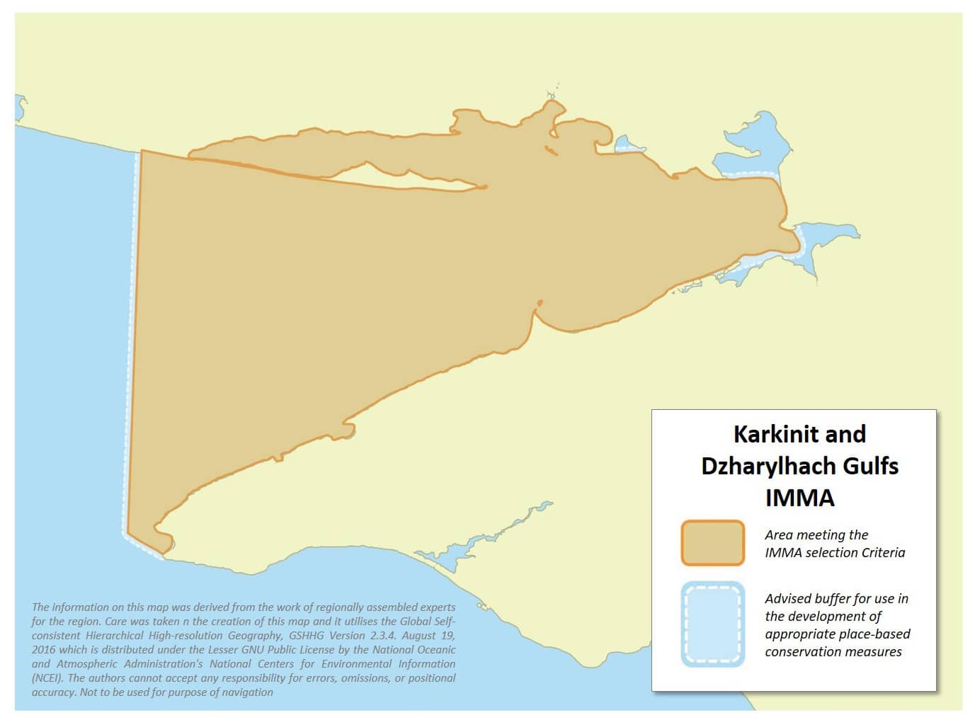The Karkinit and Dzharylhach (Carılğaç) Gulfs separate the northwestern Crimean Peninsula from the northern Ukraine mainland, and include the coastal waters between Lazurne and the Tarkhankut Cape. The IMMA includes coastal waters at depths between 0 and 30 m. All three Black Sea cetacean species inhabit and feed in the area, common dolphin (Delphinus delphis ponticus), harbour porpoise (Phocoena phocoena relicta) and bottlenose dolphin (Tursiops truncatus ponticus). The IMMA is an important summer seasonal area for the local coastal populations of bottlenose dolphins and common dolphins which show strong site fidelity during at least several years, forming stable alliances and reproducing in the area; also, remarkably dense aggregations of harbour porpoises are seen there in summer.