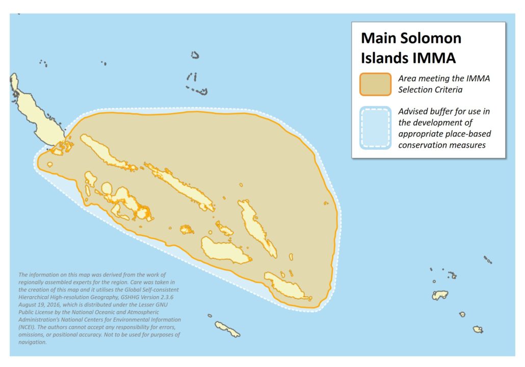 The Main Solomon Islands IMMA includes coastal and offshore waters located in the north-west part of the Solomon Islands, around the islands of Guadalcanal, Malaita, Santa Isabel and New Georgia. Overall, knowledge on marine mammal populations in the area remains scarce but a few dedicated surveys have highlighted a high diversity of species (21) and this is an area of aggregation for Omura’s whales (Balaenoptera omurai). Photo-identification and genetic data support the presence of small, resident, populations of coastal dolphins, that are genetically distinct from neighbouring populations (spinner dolphins (Stenella longirostris) and Indo-pacific bottlenose dolphins (Tursiops aduncus)). Finally, dugongs (Dugong dugon) (Vulnerable on the IUCN Red List) are widely distributed in the IMMA.