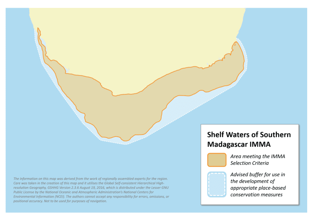 The area encompasses the wide portion of the continental shelf waters and slope off Southern Madagascar. The western edge approximates the location of the town of Androka in southwest Madagascar and extends eastwards to Tôlanaro / Fort Dauphin, and extends seaward to encompass the upper half of the continental slope. This area contains important habitat for aggregations of breeding humpback whales (Megaptera novaeangliae) and also represents an important portion of the migration route for this species in the region. Kernel density models demonstrate a breeding ‘hotspot’ in the waters off southern Madagascar for humpback whales satellite tagged off Reunion Island for both males and females with calf, although relatively more so for males, as well as for whales satellite tagged in the southwest of Madagascar off Toliara / Anakao. These ‘hotspots’ are observed to span the waters from the coastline out to the continental shelf edge on the eastern portion of the shelf and were used to delineate the eastern boundary of the area.