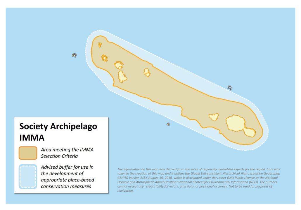 The IMMA includes coastal and nearshore waters of the main islands in the Society Archipelago (from Bora Bora in the north-west to Tahiti in the south-east) of French Polynesia. Three species form the basis of the IMMA designation: humpback whales (Megaptera novaeangliae), spinner dolphins (Stenella longirostris) and rough-toothed dolphins (Steno bredanensis). High densities of humpback whales (Megaptera novaeangliae) belonging to the Endangered Oceania subpopulation are seen in this area during Austral winter. Spinner and rough-toothed dolphins form small and resident populations across the archipelago, and have been found to be genetically distinct from other populations in the region. The IMMA is included in the whale and dolphin national sanctuary under French Polynesian jurisdiction.